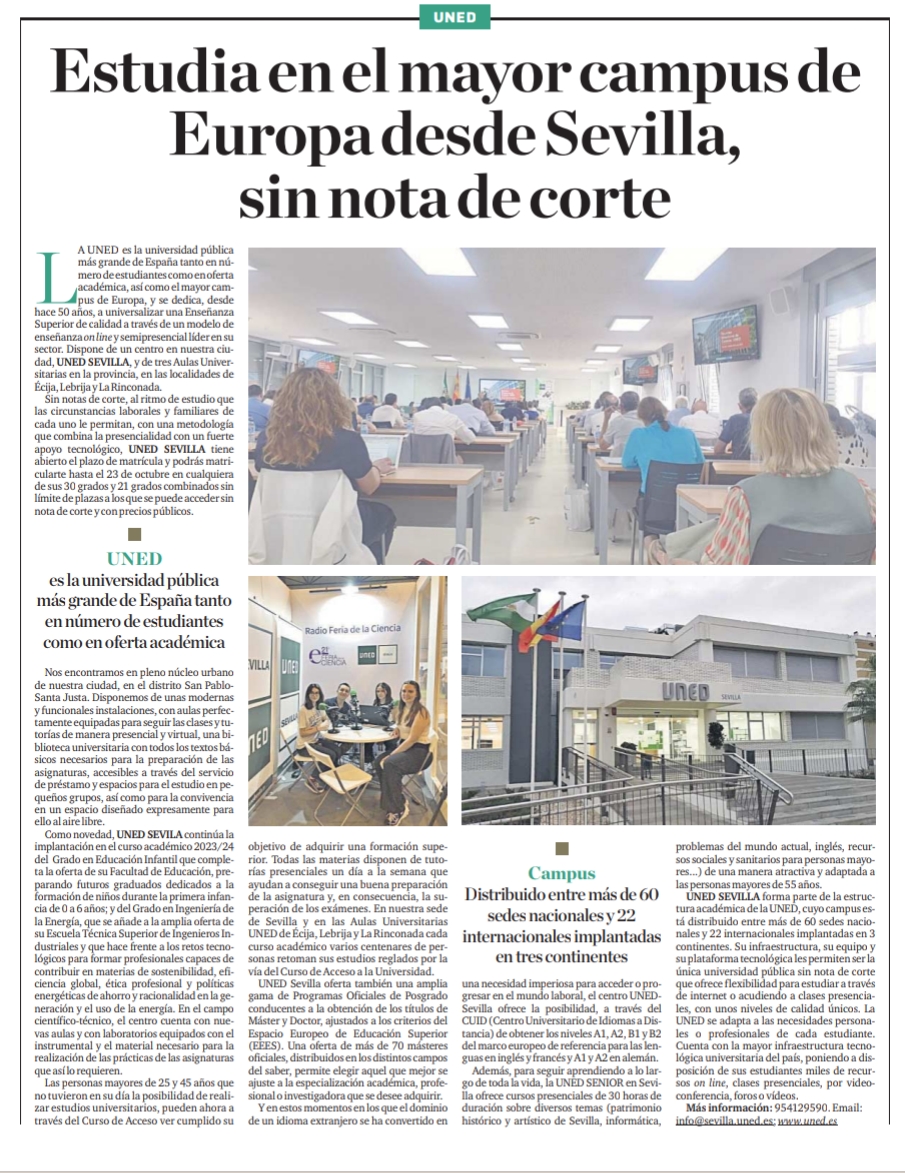 Durante el pasado curso académico UNED Sevilla mereció la confianza de más de 6.000 estudiantes que la eligieron para realizar alguno de los 32 Grados Universitarios que integran su oferta académica o un Máster Oficial de la amplia oferta disponible, a través de una metodología semipresencial que combina el uso de la tecnología con la presencia en las aulas un día a la semana.