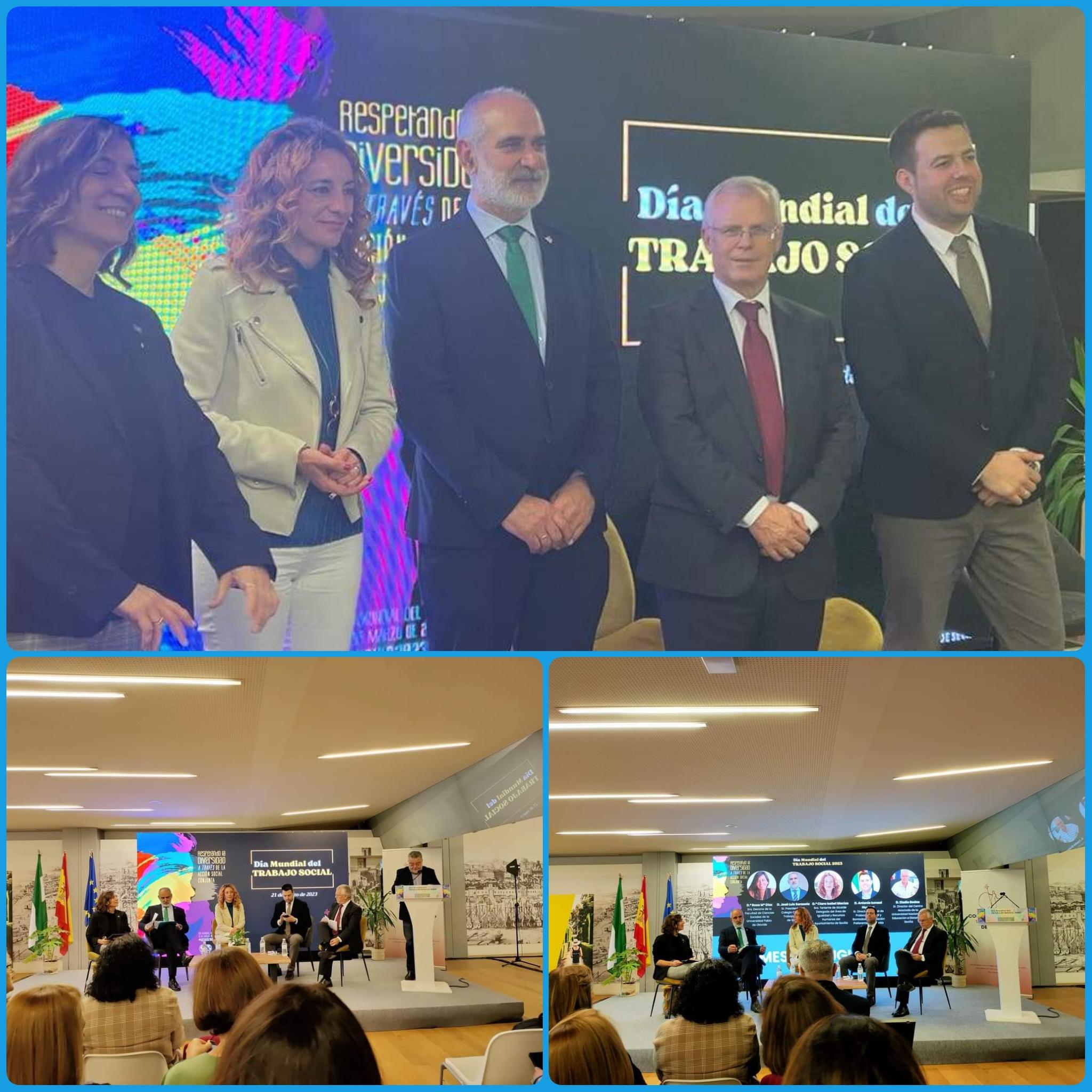 Hemos tenido la ocasión de compartir un acto entrañable y emotivo de reconocimiento a los profesionales del Trabajo Social, pero también de análisis y reflexiones sobre la insustituible labor que llevan a cabo en favor de las personas, los grupos y colectivos más vulnerables. Enhorabuena al Colegio de Trabajo Social por la excelente organización. Ha sido un honor y una satisfacción compartir mesa con la Decana de Ciencias Sociales de la Universidad Pablo de Olavide, Dña. Rosa María Diaz; el Director General de Bienestar Social y Barriadas de Actuación Preferente de la Junta de Andalucía, D. Antonio Ismael Huertas; la Teniente de Alcalde de Igualdad y Recursos Humanos del Ayuntamiento de Sevilla, Dña. Clara Macías y el Presidente del Colegio Oficial de Trabajo Social de Sevilla, D. Jose Luis Sarasola.