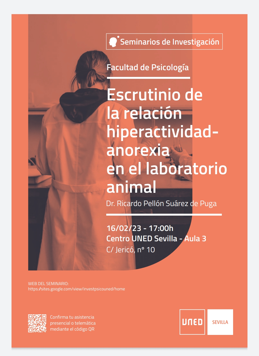 El próximo día 16 de febrero del 2023 tendrá lugar en el centro UNED-Sevilla una serie de Seminarios de Investigación emitidos desde la Facultad de Psicología de la UNED que llevan por título ESCRUTINIO DE LA RELACIÓN HIPERACTIVIDAD-ANOREXIA EN EL LABORATORIO ANIMAL llevado a cabo por Dr. Ricardo Pellón Suárez de Puga en el Aula 3 del centro UNED-Sevilla.