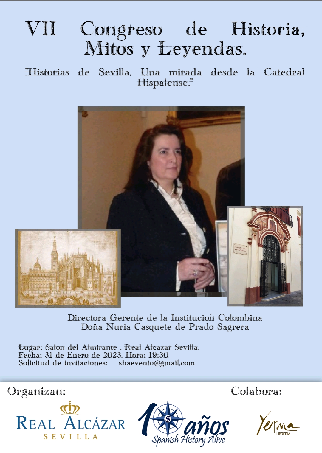 El pasado 31 de enero UNED-Sevilla estuvo presente en el VII Congreso de la Historia, Mitos y Leyendas, “Historias de Sevilla. Una mirada desde la Catedral Hispalense”, acto que presidió el Alcaide del Real Alcázar de Sevilla junto a la ponente, la Doctora Dña. Nuria Casquete de Prado Sagrera, Directora Gerente de la Institución Colombina.