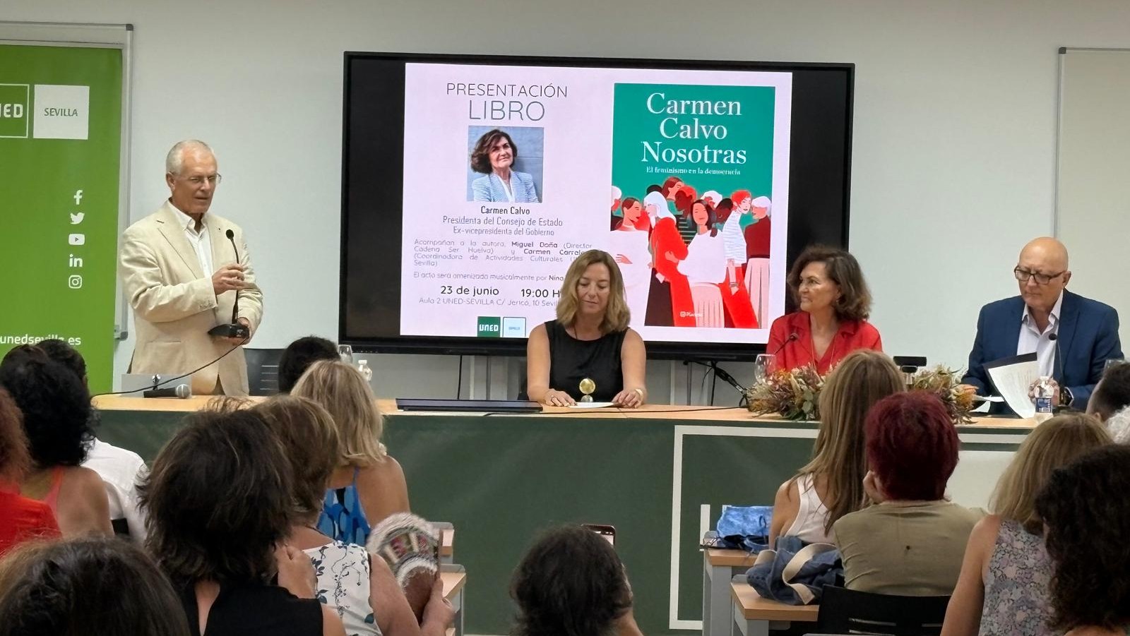 UNED Sevilla acogió este lunes la presentación del libro “Nosotras, el feminismo en la democracia”, de Carmen Calvo, presidenta del Consejo de Estado, que compartió con el público las principales reflexiones que estructuran su obra, publicada por la editorial Planeta, donde repasa los momentos clave del feminismo en la democracia española y el largo camino recorrido por las mujeres hasta alcanzar los derechos actuales.