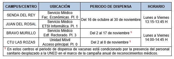 Teniendo en cuenta los condicionantes derivados del calendario oficial de vacunación y su coincidencia con la campaña anual de reconocimientos médicos de la UNED, es muy importante atender las instrucciones que figuran en la presente convocatoria, considerando, en particular, las fechas de finalización establecidas en los distintos campus con objeto de minimizar el desperdicio de las dosis de vacuna disponibles.