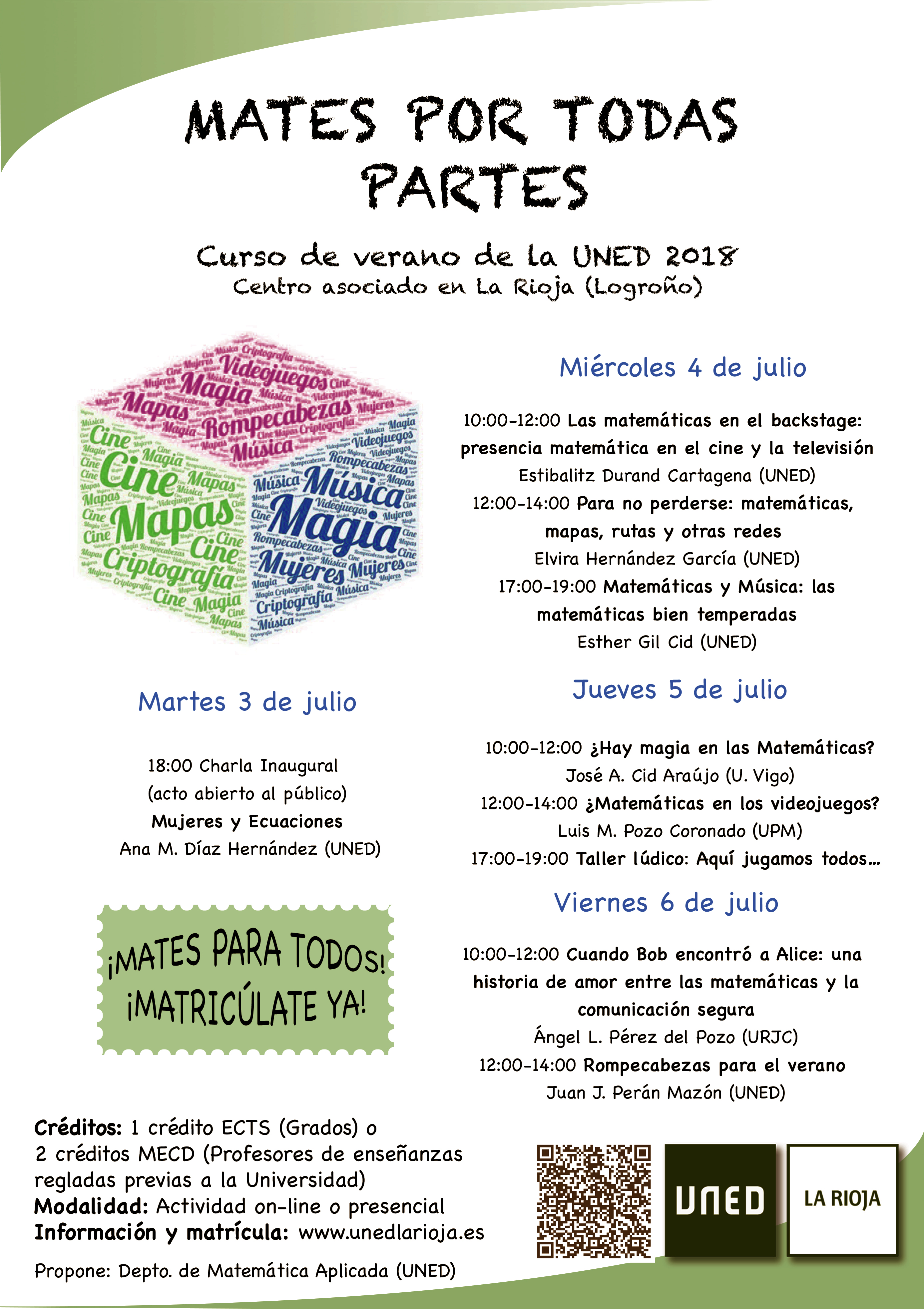 - Curso de verano UNED Mates por todas partes, Centro asociado de La Rioja, 4 y 5 de julio de 2018.