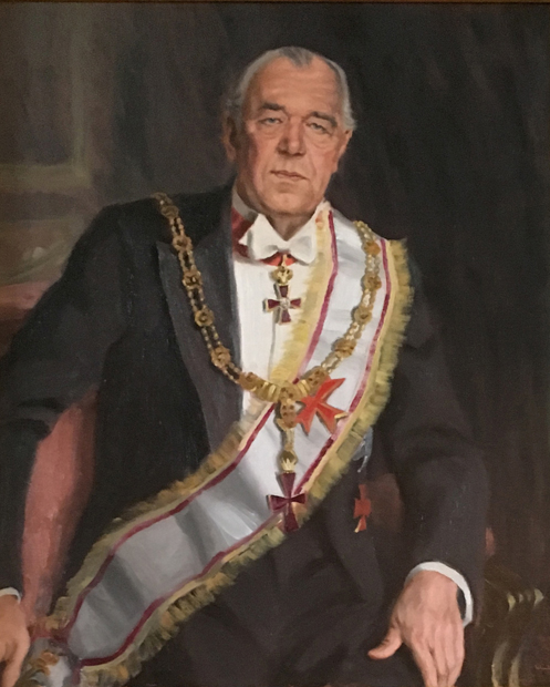 El príncipe Bertil (1935-1997), gran maestro de los masones suecos y diputado gran maestre de la Real Orden de Carlos XIII, aparece con la banda del último grado del rito sueco y el collar y venera de la Orden (Palacio Baatska, Estocolmo, sede de los masones suecos).