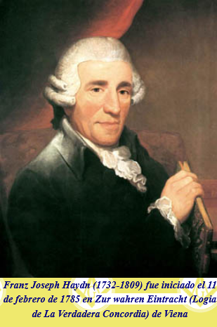 Franz Joseph Haydn fue iniciado el 11 de febrero de 1785 en Zur wahren Eintracht (Logia de La Verdadera Concordia) de Viena. Realizó diversos trabajos rituales pertenecientes al Rito de Zinnendorf y estuvo confeccionando algunos cantos de carácter ritual masónico como “La Creación”, basada en el libro bíblico del Génesis. Su obra musical es amplísima destacando las siguientes obras: ciento veinticinco sinfonías, treinta y un conciertos, setenta y siete cuartetos, treinta tríos y más de trescientas composiciones para instrumentos de cuerda y viento. En lo referente a la Música eclesiástica, el compositor austriaco produce catorce misas, un “Stabat mater”, dos “Te Deums” y treinta y cuatro ofertorios e himnos. También destaca en el campo de la escritura vocal resaltando algunas canciones de tres y cuatro partes. Construyó una veintena de óperas (Acis y Galatea, La cantante…). Finalmente, las obras que han inmortalizado la figura de J. Haydn, han sido “El Regreso de Tobías” (1775), “Las últimas Siete palabras de Cristo” (1787) y “La Creación” (1791). En conclusión, F. J. Haydn es considerado un destacado compositor austriaco muy laureado por la abundancia y calidad en sus obras que actualmente han sido clasificadas con un destacado estilo y brillante composición.