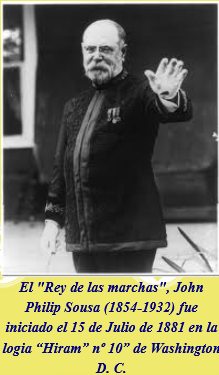 En masonería, John Philip Sousa tuvo una vida muy intensa. El compositor y director estadounidense fue iniciado el 15 de Julio de 1881 en la logia “Hiram” nº 10” de Washington D.C. El 2 de septiembre fue pasado al grado de compañero y, poco después elevado al grado de maestro. Estuvo afiliado a diversas logias y organizaciones paramasónicas. Entre sus composiciones musicales se pueden resaltar más de ciento cuarenta marchas militares, once operetas y dos poemas sinfónicos. Entre ellas se pueden resaltar las siguientes obras: “Transit of Venus March”(1883), “Semper Fidelis” (1888),“The Washington Post” (1883),“The Gladiator”(1886),“The Thunderer” (1889),“Liberty Bell” (1893) y “The Stars and Stripes Forever”(1896). También se pueden resaltar sus Operetas: “The Queen of Hearts” (1885), “The Smugglers” (1882), “The Bride Elect” (1897) y “Chris and the Wonderful Lamp” (1899).