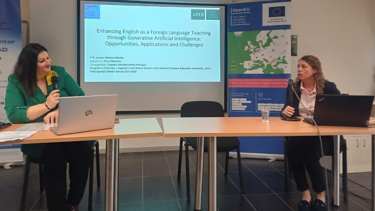 Por su parte, Mónica Vilhelm, doctoranda del programa de doctorado Filología. Estudios Lingüísticos y Literarios expuso su proyecto “Enhancing English as a Foreign Language Teaching through Generative Artificial Intelligence: Opportunities, Applications and Challenges”, dirigido por la Dra. Elena Bárcena, catedrática de la Facultad de Filología de la UNED, y codirigido por la Dra. Ángeles Sánchez-Elvira Paniagua, profesora de la Facultad de Psicología y directora de la Cátedra UNESCO de Educación a Distancia. Mónica Vilhelm participó de forma presencial en el evento.