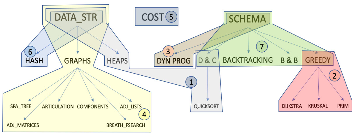 esto se debe a que algunas cuestiones relacionadas con el "coste algorítmico" afectan a estos dos tipos de etiquetas. Por último, el tema 7 contiene preguntas sobre diversos esquemas algorítmicos como "divide y vencerás", "backtracking", "ramificación y poda" y "greedy".