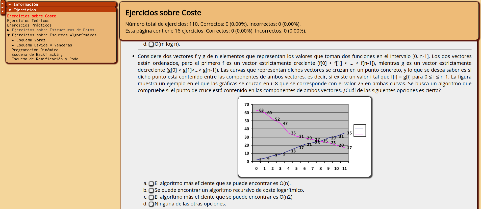 Herramienta Web Interactiva de recomendación de ejercicios de refuerzo. En paralelo a lo anterior, se enriqueció el corpus de ejercicios de test extraídos de exámenes anteriores, añadiendo a cada ejercicio una serie de metadatos sobre su situación en la jerarquía de conceptos de la asignatura, las frases clave extraídas del enunciado y posibles imágenes asociadas, así como cuál de las posibles respuestas es la verdadera. Al mismo tiempo, se iba realizando el diseño de la herramienta web interactiva y su desarrollo. Cada característica diseñada, se integraba en la aplicación y se comprobaba si los metadatos presentes eran suficientes o se necesitaba añadir alguno más. Una vez integrada, la aplicación era probada por los integrantes del Grupo de Innovación Docente y el Equipo Docente de la asignatura de Programación y Estructuras de Datos Avanzadas.