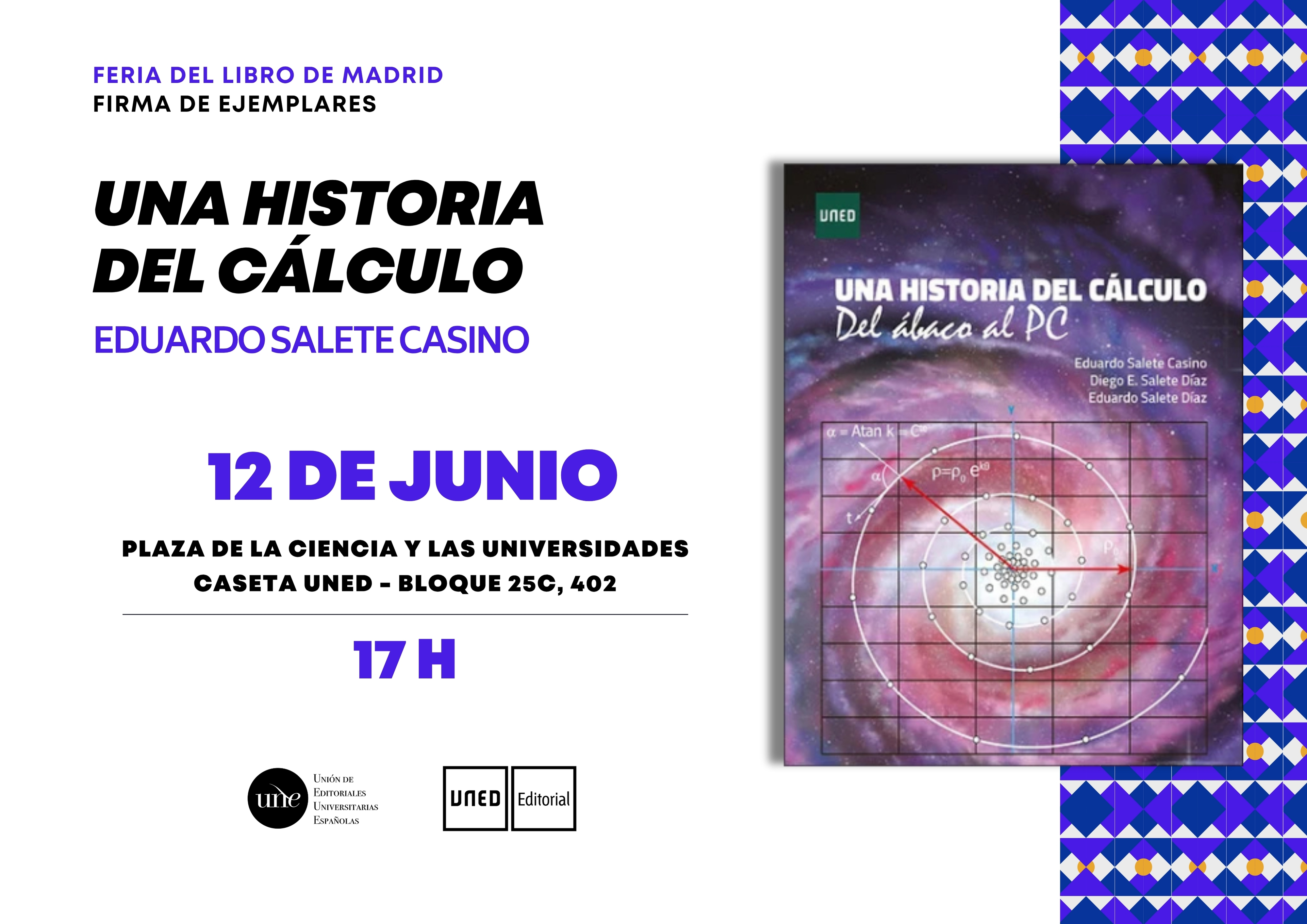 Dentro de las actividades de la Feria del Libro de Madrid 2025, el día 12 de junio a las 17 h, uno de los autores, Eduardo Salete Casino, firmará ejemplares de su libro Una historia del cálculo. Del ábaco al PC en la caseta de la Editorial UNED n.º 402, bloque 25C situada en la plaza de la Ciencia y de las Universidades.