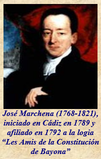 José Marchena fue iniciado en Cádiz, al parecer 1789 y tres años después era afiliado a la logia “Les Amis de la Constitución de Bayona”. Marchena llegó a ser el intérprete personal de José Bonaparte, cuando éste fue Rey de España.