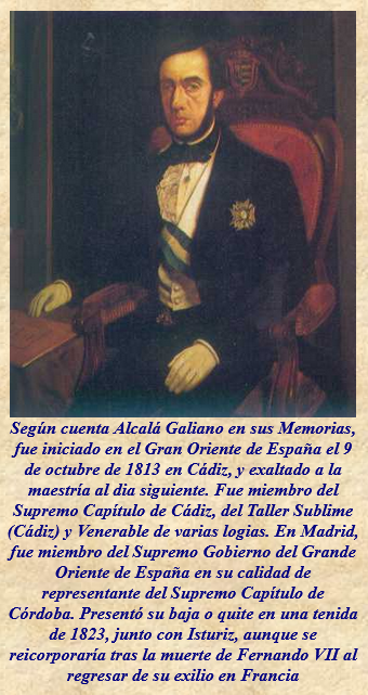 El 9 de octubre de 1813 es recibido masón en Cádiz; “di un paso de importancia para mi vida futura. Éste fue el de iniciarme en cierta famosa y antigua sociedad secreta” (Antonio Alcalá Galiano, Memorias I, Capítulo XXXII).