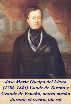 José María Queipo de Llano (1786-1843), conde de Toreno y Grande de España, fue uno de los líderes de la masonería liberal en su tendencia moderada. Tras el levantamiento del 2 de mayo de 1808 contra los franceses, formó parte, junto a Álvaro Flórez Estrada, de la Junta general del Principado de Asturias que se autoproclamó soberana frente a Napoleón. Viajó entonces a Londres en misión diplomática para recabar el apoyo británico contra Francia. Posteriormente se trasladaría a Sevilla y Cádiz, como diputado liberal en el grupo de Agustín Argüelles. Allí apoyó el programa de reformas liberales y el proyecto constitucional basado en la soberanía nacional y en la división de poderes. En este punto, el conde de Toreno se mostró partidario de impedir al monarca el derecho de veto de las leyes aprobadas en Cortes, medida que finalmente no prosperó. Tras la vuelta del absolutismo en 1814 fue condenado a muerte y sus bienes, confiscados. Refugiado en Londres y luego en París, apoyó diversos intentos de restaurar el régimen constitucional en España como el protagonizado en La Coruña el 19 de septiembre de 1815 por su cuñado el general Juan Díaz Porlier, el cual fue, por ello, condenado a la horca. Embebido del liberalismo doctrinario francés, el conde de Toreno sería, durante el Trienio, uno de los líderes del liberalismo moderado, frente a los reaccionarios anti-constitucionalistas y a los liberales exaltados.