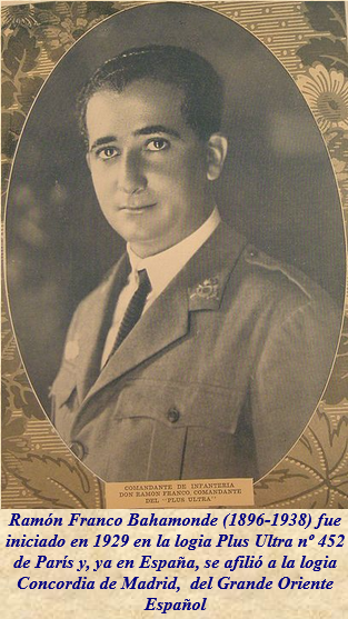 Ramón Franco Bahamonde (1896-1938), comandante y después teniente coronel, hermano menor del dictador Francisco Franco, fue un celebrado piloto que formó parte del vuelo del hidroavión Plus Ultra que salió de Palos de la Frontera (Huelva) y llegó a Buenos Aires (Argentina) en 1926, un año antes de que el también masón Lindbergh volara en solitario desde Estados Unidos a Europa. En ese mismo año de 1926 —y al igual que su hermano Francisco tres años antes— Ramón Franco fue nombrado gentilhombre de cámara de Alfonso XIII, cargo que había pretendido y que aceptó pese a su profesión de fe republicana.
