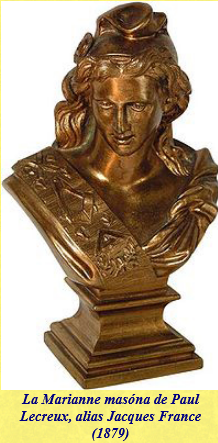 La segunda representación femenina corresponde a la mujer militante y guerrera que lucha por la instauración de la República. Aparece bajo los rasgos de una mujer del pueblo llamada Marianne, vestida a lo antiguo con gorro frigio y pregona el ideal de libertad, igualdad y fraternidad. Antes de 1848, las primeras alegorías de la República se inspiran en la diosa Minerva, blandiendo una lanza en la mano derecha, una escuadra y un compás en la mano izquierda que sirvieron de inspiración a las actuales representaciones de la Marianne. En 1879 aparece la famosa Marianne masónica de Paul Lecreux, alias Jacques France, de la cual, la versión profana alcanzó gran éxito en los Ayuntamientos. Su gorro frigio nos recuerda el rito de emancipación en la República romana por el cual se cubría con un gorro al esclavo liberados.