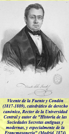 Hay quienes se preguntan si la Francmasonería es judía; otros identifican sin más a los masones con los judíos, o a éstos con la tolerancia moderna, o con el odio a la Iglesia. Estas características del peligro judeomasónico contra la Iglesia católica y algunos países en concreto, como, por ejemplo, España, han sido copiosamente cultivadas, entre otros, por Vicente de la Fuente en su Historia de las Sociedades Secretas antiguas y modernas, y especialmente de la Francmasonería (Madrid, 1874); Tirado y Rojas, La Masonería en España (Madrid, 1893), y Las Tras-logias (Madrid, 1895), y Nicolás Serra y Causa, El Judaísmo y la Masonería (Barcelona, 1907), en los que domina la idea fija de que el Judaísmo es el padre y origen de la Masonería y de cuanto de malo y revolucionario ocurre en el mundo.